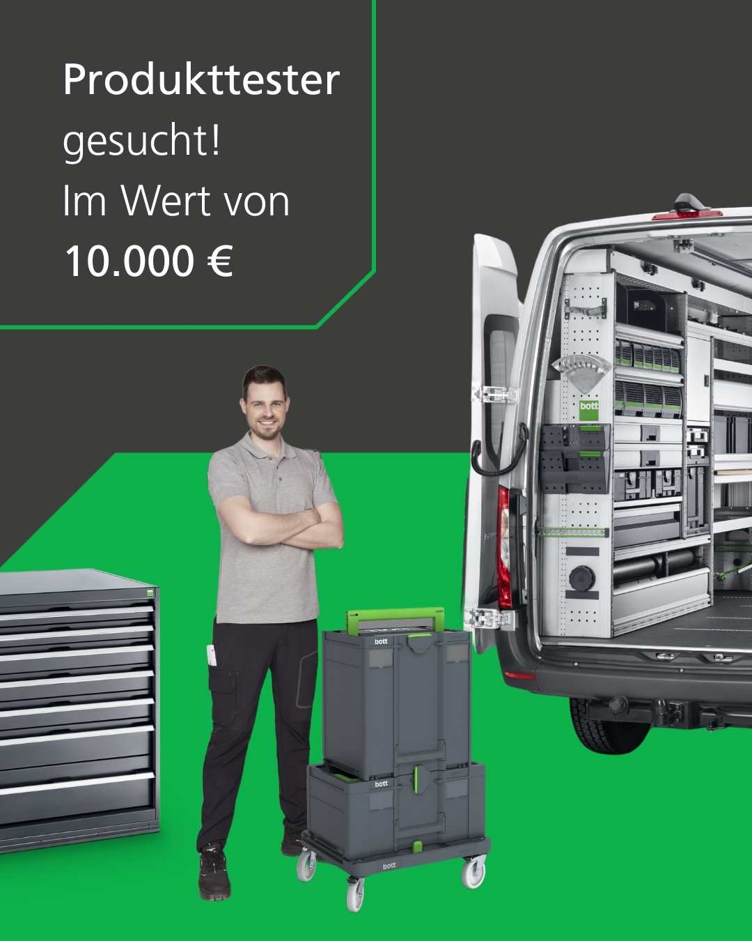 Wählen Sie als ausgewählter Produkttester aus der gesamten bott Produktpalette aus. Mit hochwertiger Fahrzeug-, Betriebs- oder Arbeitsplatzeinrichtung schaffen Sie sich die ideale Grundlage für das Wachstum Ihres jungen Unternehmens.